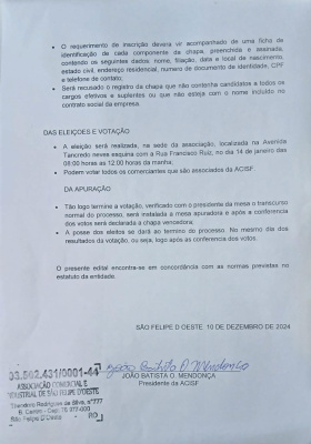A Associação Comercial E Industrial De São Felipe D`Oeste RO (ACISF), por intermédio de seu Presidente João Batista O. Mendonça, no uso de suas atribuições, convoca todos os associados para participarem da eleição e posse (BIÊNIO 2025/2027) a serem realizadas no dia 14 de janeiro de 2025, das 08:00 horas  as 12:00 horas da manhã,  na sede da associação que fica localizada na AV. Tancredo neves, esquina com a rua Francisco Ruiz , quando serão eleitos os membros para compor a diretoria da associação.