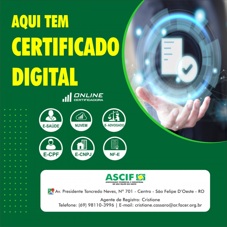 Adquira agora o Certificado Digital tanto para pessoa fisica ou jurídica na  Associação Comerciais e Industrial de São Felipe d'Oeste -RO. A certificação digital é um documento eletrônico que possibilita comprovar a identidade de uma pessoa, uma empresa ou um site, pa...