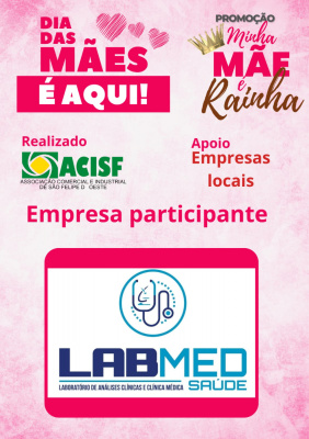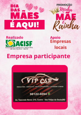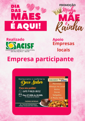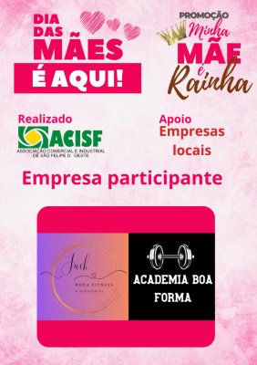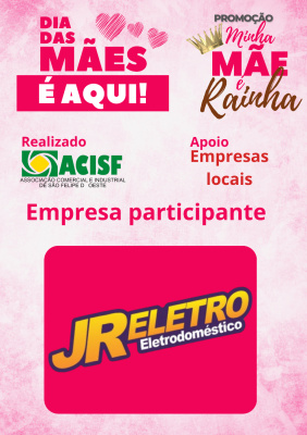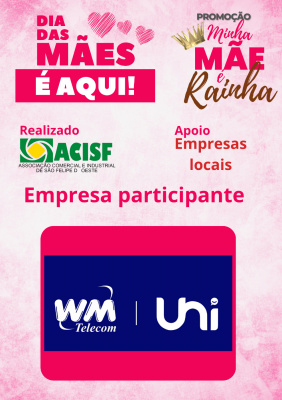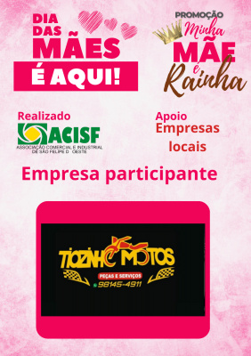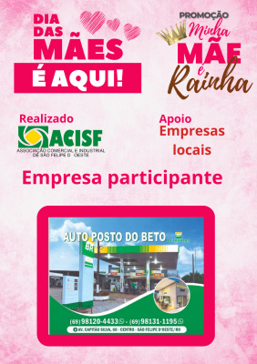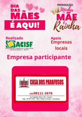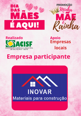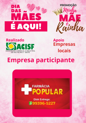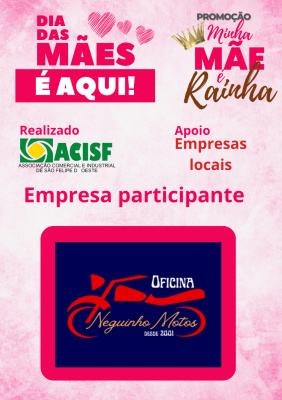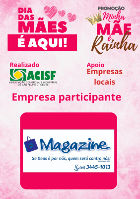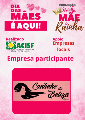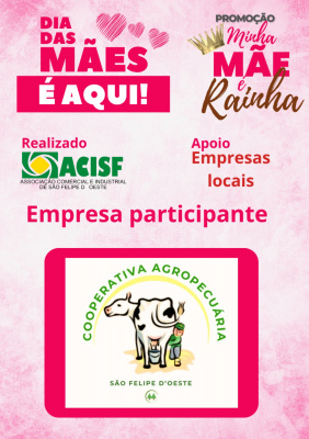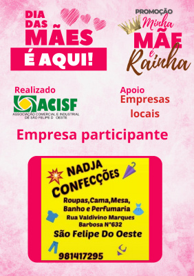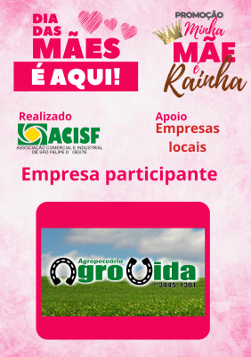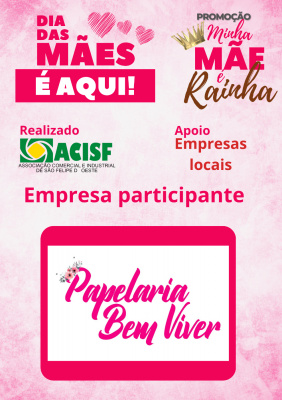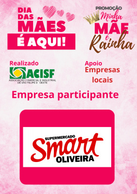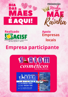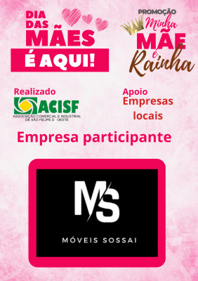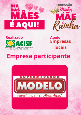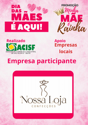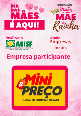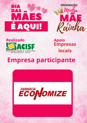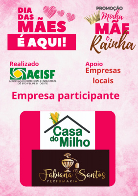 Promoção Minha Mãe é uma Rainha já começou, compre nas empresas participantes, preencha seu cupom e concorra a vários brindes. Sorteio dia 11 de maio em uma live pelo facebook da Acisf. Compre no comércio local e concorra a prêmios.